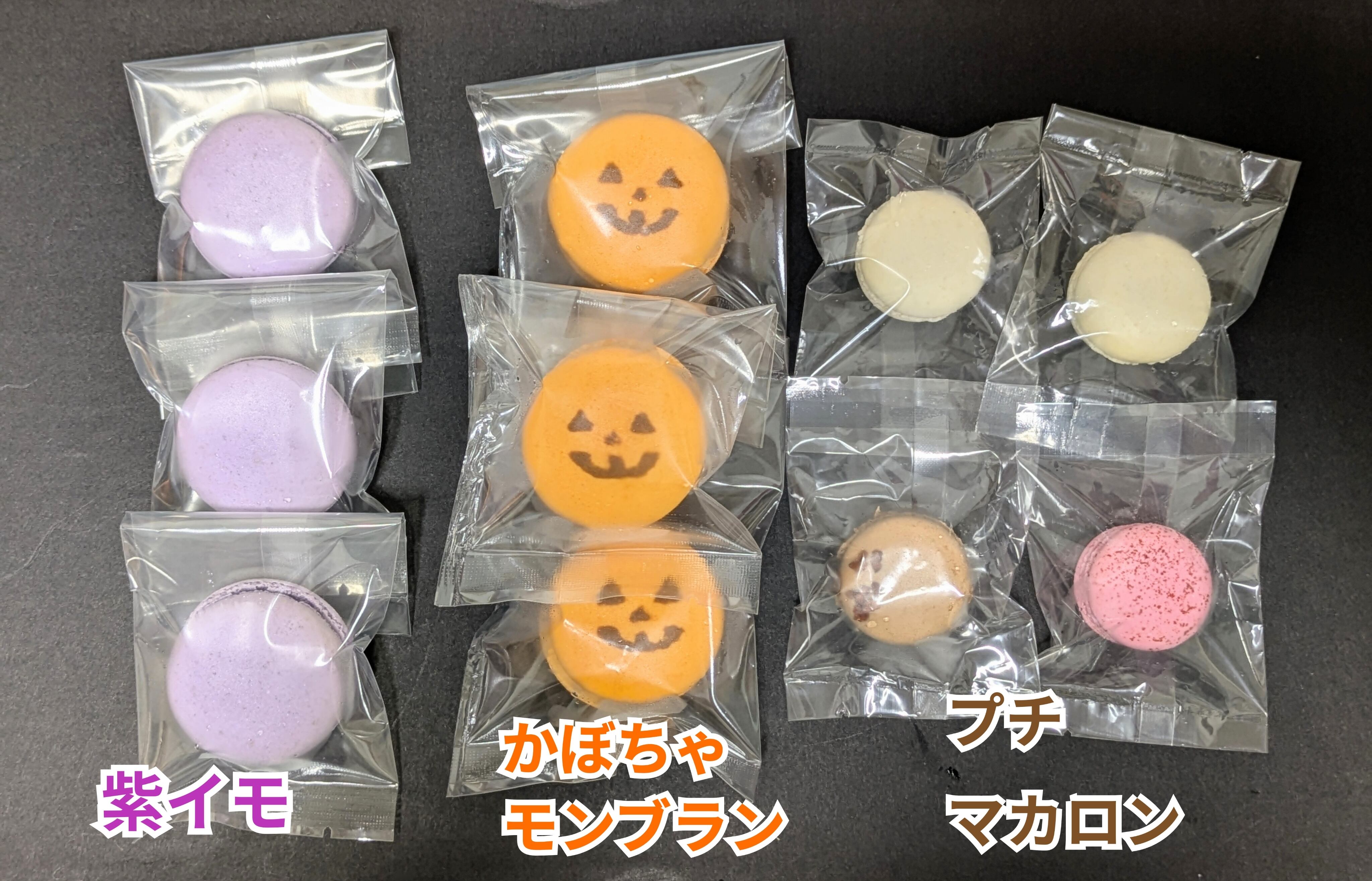 食べるのが勿体ない、ジャック・オー・ランタンの顔をしたマカロンや、紫イモのマカロン、そして小さいプチマカロンの詰め合わせです。