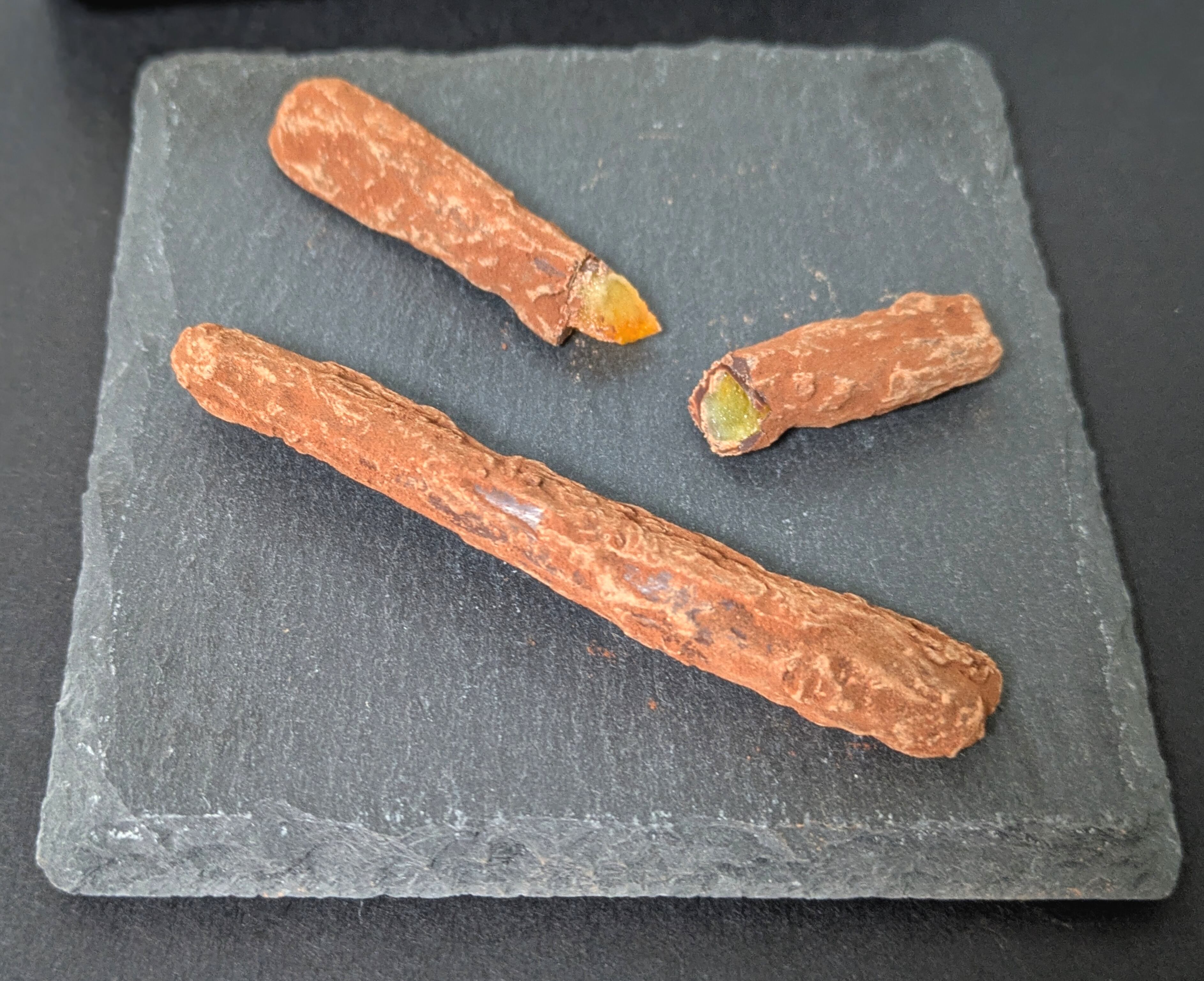 オレンジの皮のシロップ漬けをチョコレートとココアパウダーでコーティングしたチョコレート菓子です。