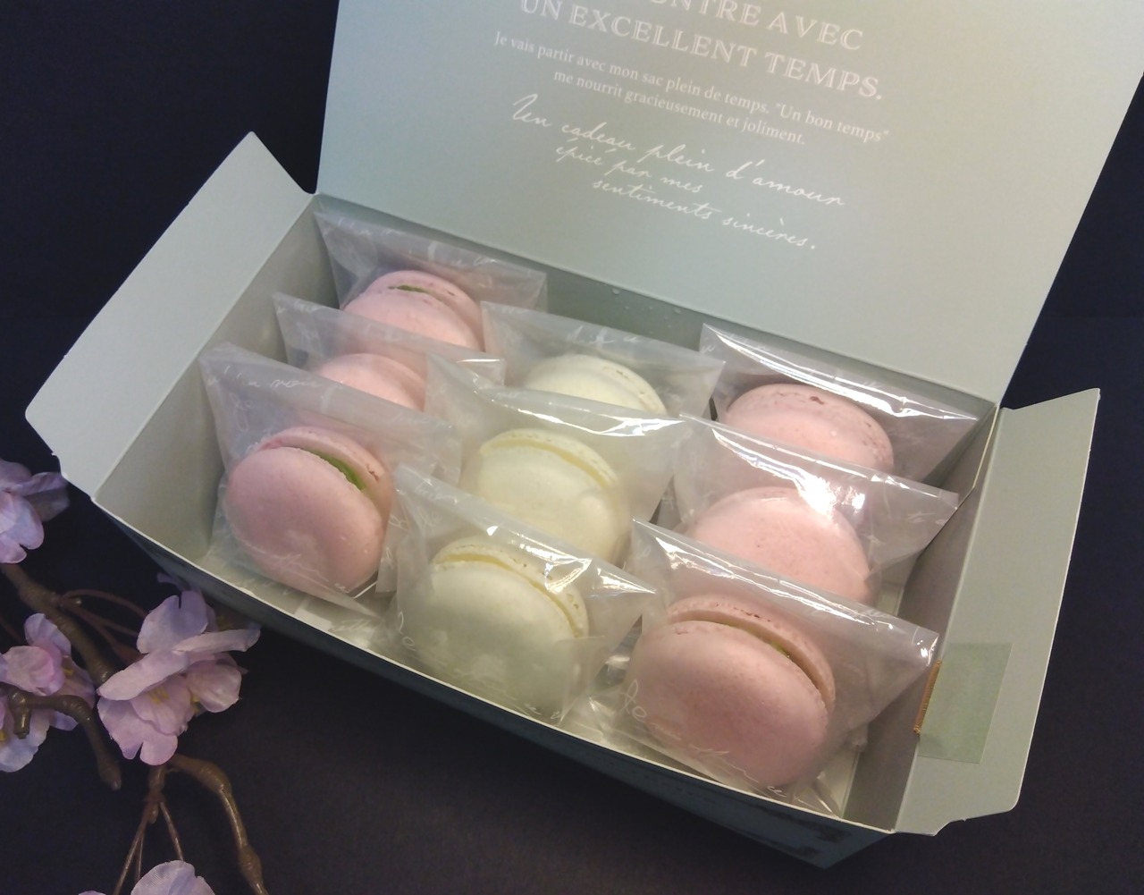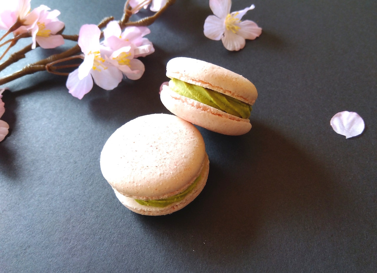 桜が香るマカロン生地は、ほんのり塩味があり抹茶のガナッシュと相性抜群です。